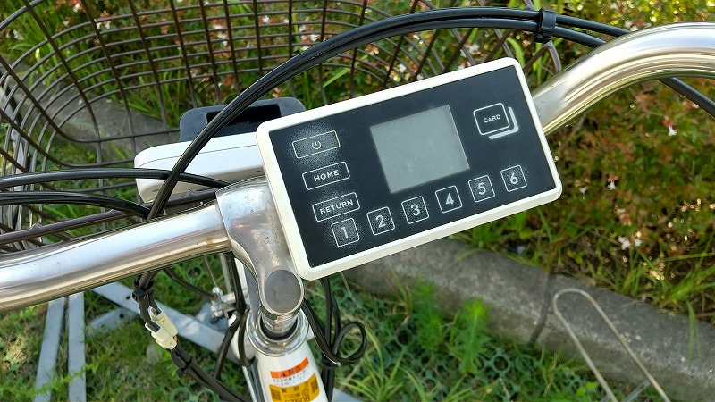 返却できる自転車ステーションに自転車を持っていき停めます。ハンドル中央のパネルの電源を入れて返却予約を選択します。